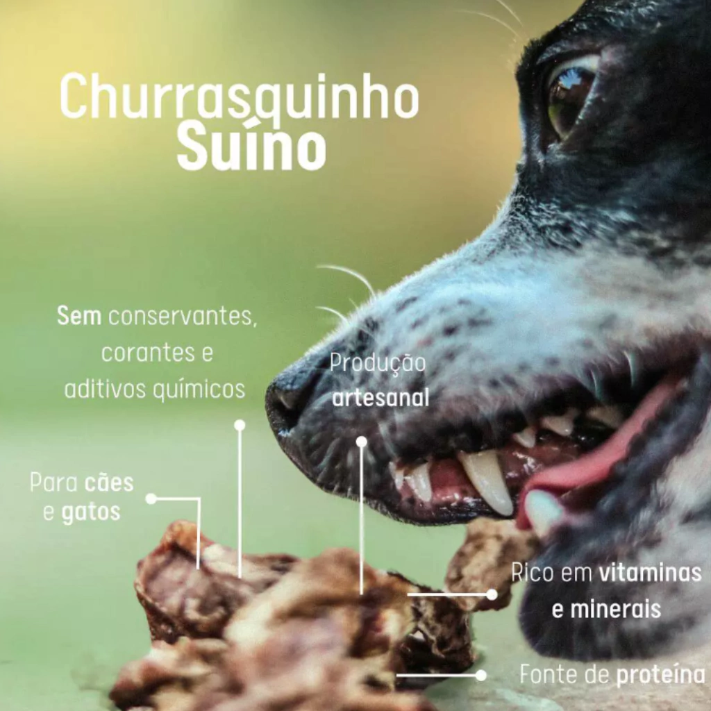 O Churrasquinho Suíno é um petisco 100% natural, saboroso e nutritivo, feito com apenas um ingrediente: pulmão suíno desidratado.