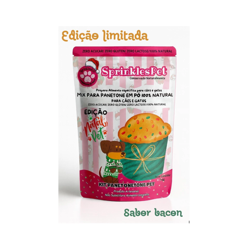 O Panetone Pet mais esperado do ano no chegou em uma versão prática, segura e totalmente natural para preparar em casa. O Kit Panetone Pet SprinklesPet™ vem completo para produzir 1 panetone pet de 100 g, com textura macia, aroma delicioso e cobertura colorida feita com biscoitos SprinklesPet™ artesanais, utilizados tanto como confeitos quanto na composição do glacê vegano patenteado.